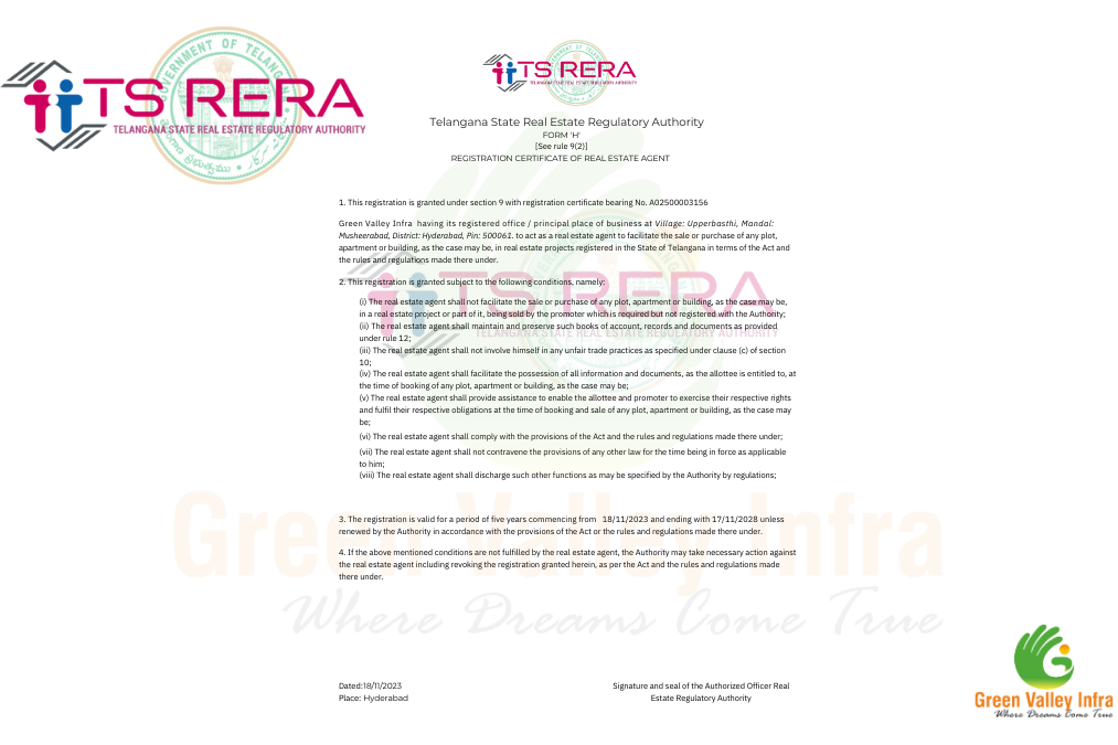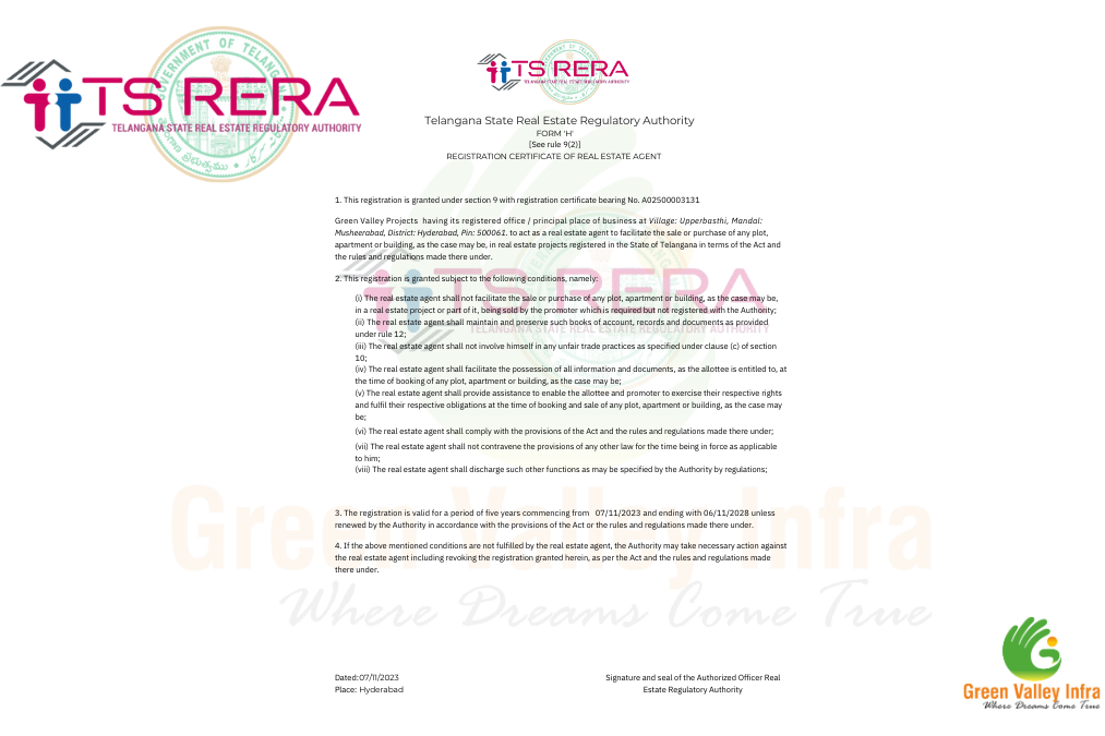 Green Valley Infra is a distinguished real estate company proudly certified under RERA (Real Estate Regulation and Development Act, 2016). This central legislation, which was introduced in Telangana, is designed to enhance transparency and accountability in the real estate sector. RERA establishes a set of rigorous standards and regulations to ensure that real estate transactions are conducted with fairness and integrity, providing a structured framework for both developers and consumers.